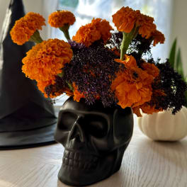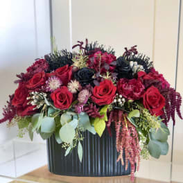 Price: $325.00 Halloween Delight - Fresh Black Roses, Eucalyptus, Amaranthus, Pincusion Protea and more