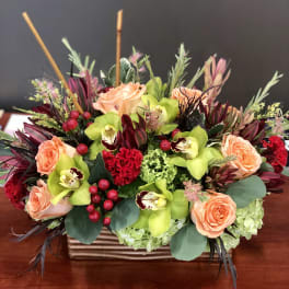 Price: $120.00 Heidi - Long Centerpiece, roses, hydrangeas, kale flowers, orchids Product Tags: Next-day Delivery