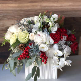 Price: $275.00 Let it Snow ! Festive Holiday Flowers in a White Ceramic Vase Product Tags: Next-day Delivery