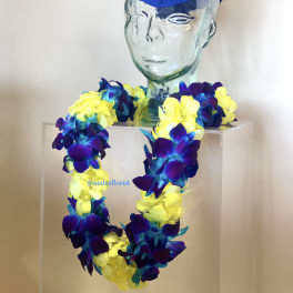 Price: $60.00 Double Orchid Lei - UC Colors! Dual Yellow and Blue (Pre-order required) Product Tags: Next-day Delivery
