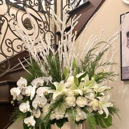 Price: $275.00 Let it Snow ! Festive Holiday Flowers in a White Ceramic Vase Product Tags: Same-day Delivery