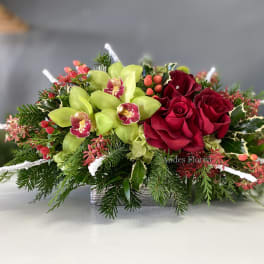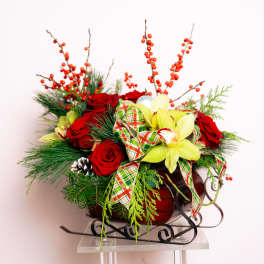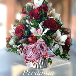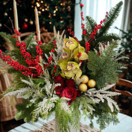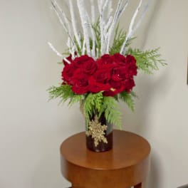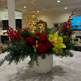 Price: $275.00 Let it Snow ! Festive Holiday Flowers in a White Ceramic Vase Product Tags: Same-day Delivery
